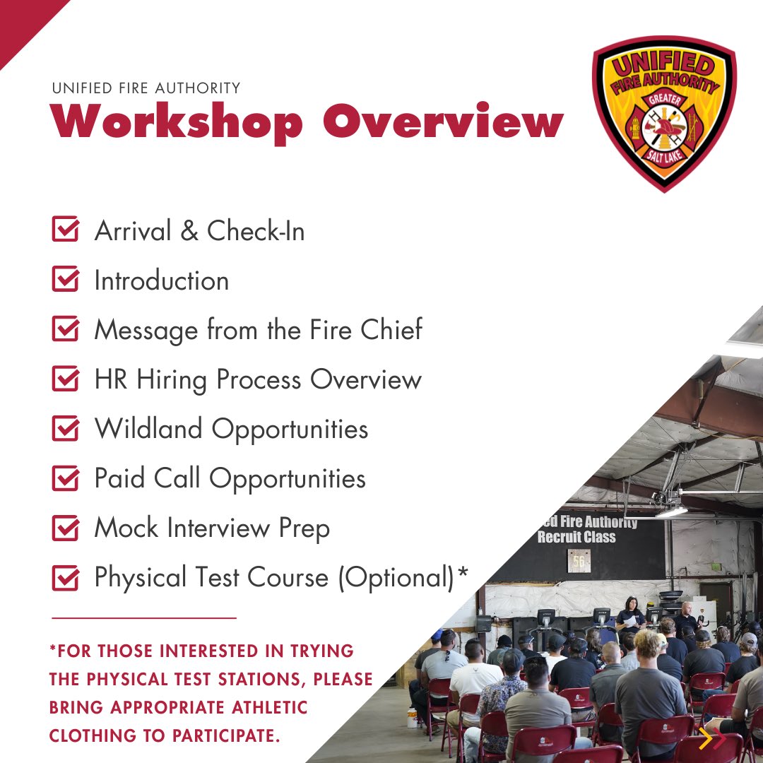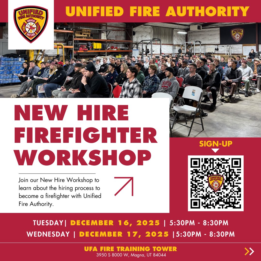 The Unified Fire Authority is holding two identical New Hire Workshops. These workshops will review our organization, discuss the testing process, practice interviewing skills, and review the physical fitness test.