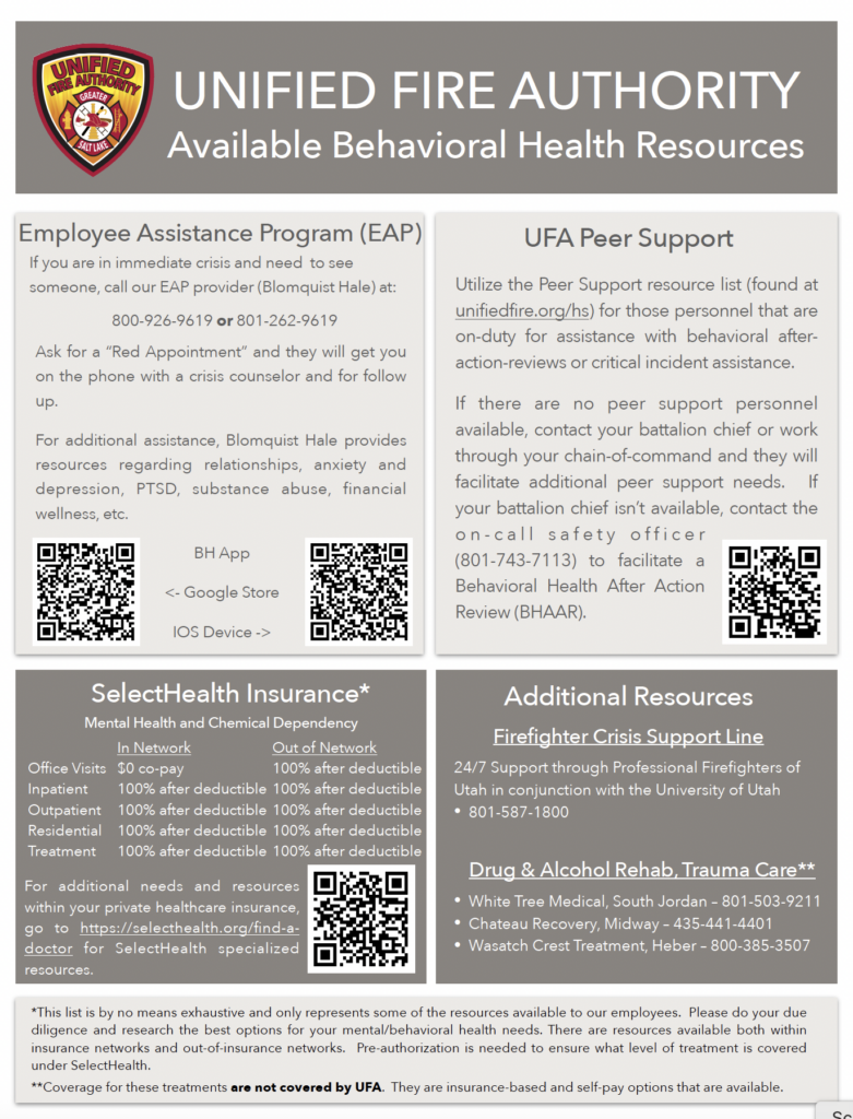 Health & Safety Forms/Reports UFA First Report of Injury(Printable) UFA First Report of Injury(Adobe Sign) IncidentCollision Report Form EJA Release Form EJA Release Form – QR Light Duty Request Form UOSH 350Exposure Form University of Utah Bloodborne Pathogen Exposure Protocol Peer Support and Behavioral Health Resources Initial Intake Form Peer Support List Release of Information External Agency BH Referral List BH Treatment Form BH Resources Peer Support Interaction Form Safety Websites